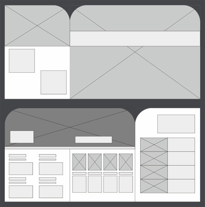 我常用的把版式下來的方法是文字用豆腐塊,圖片的用框框再在里邊打個叉叉,用不同的灰度表示層次: