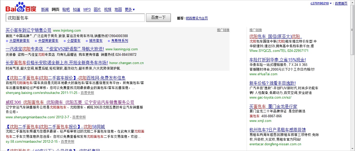關(guān)鍵詞選擇:沈陽(yáng)面包車 優(yōu)化效果:百度排名第一頁(yè)