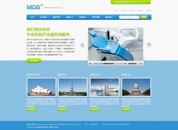 design frontier設(shè)計前沿當前位置:首頁>主要服務(wù)>網(wǎng)站設(shè)計>設(shè)計前沿【理論】醫(yī)療法規(guī)咨詢公司網(wǎng)站設(shè)計作品展示此網(wǎng)站是從事美國及歐洲等區(qū)域的醫(yī)療法規(guī)咨詢的網(wǎng)站,已上線運營,但客戶對于原網(wǎng)站的視覺表現(xiàn)細節(jié)不滿意,所以要求在網(wǎng)站布局不變的情況下,改進網(wǎng)站的界面設(shè)計,另外在局部區(qū)域調(diào)整網(wǎng)站信息架構(gòu),比如把首頁的主要內(nèi)容區(qū)的兩個視頻放到主視覺部分,用切換的方式依次展示;去掉對網(wǎng)站幫助不大的原主視覺區(qū)域的滑動展示圖片等內(nèi)容。所以整個設(shè)計延續(xù)了之前的色彩方案,藍色和綠色搭配, 只做了些細微的調(diào)整,讓整個的設(shè)計看上去更清爽一些。