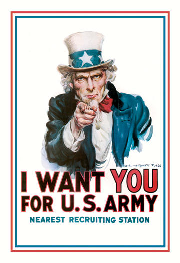 IAVA雖然是為一個(gè)為退伍軍人服務(wù)的機(jī)構(gòu),但它的形象是否受年青人歡迎同樣涉及到征兵工作。美國由于連年打戰(zhàn),所以吸引足夠多的年青人參軍并不是一件易事,特別是海外戰(zhàn)爭,僅僅通過愛國主義這些號(hào)召,是很難起到作用的,所以美國政府為了能夠吸引年青人參軍,無論在廣告還是宣傳形象上,一直都會(huì)刻意傳達(dá)出一種符合年青人思想的應(yīng)征形象。 這種宣傳從上個(gè)世紀(jì)初就已經(jīng)開始在有意識(shí)地運(yùn)用,如比較熟悉的這張海報(bào):