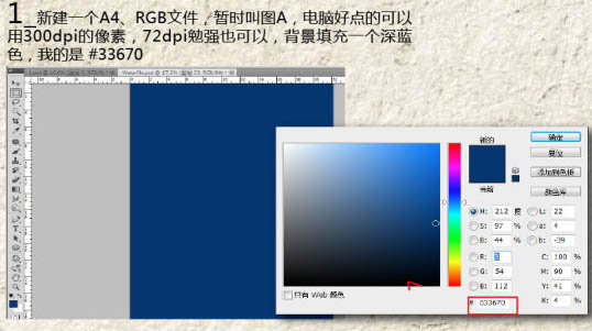 1、新建一個A4大小的文檔,背景填充深藍色:#033670。