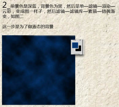 2、前景色設(shè)置為深藍色,背景色為黑色,執(zhí)行:濾鏡 > 渲染 > 云彩,確定后再執(zhí)行:濾鏡 > 濾鏡庫 > 素描 > 鉻黃漸變,這一步是為了做液態(tài)的背景。