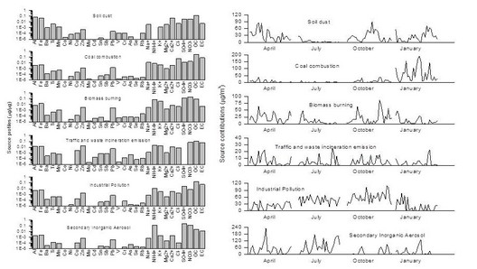 利用正矩陣因子法(PMF)解析出北京地區(qū)PM2.5的6個(gè)重要來源,分別是土壤塵、燃煤、生物質(zhì)燃燒、汽車尾氣與垃圾焚燒、工業(yè)污染和二次無機(jī)氣溶膠,這些源的平均貢獻(xiàn)分別為15%、18%、12%、4%、25%和26%。沙塵天氣常對(duì)春季氣溶膠有重要影響,而在秋冬季節(jié),來自建設(shè)工地的浮塵和街道的再懸浮塵是土壤塵的主要來源。燃煤源冬季貢獻(xiàn)最大,生物質(zhì)燃燒源貢獻(xiàn)春、秋較高,冬、夏季較低,工業(yè)污染源貢獻(xiàn)在夏秋季節(jié)較高。二次無機(jī)氣溶膠在夏季和春季的貢獻(xiàn)最高,是硫酸鹽、硝酸鹽和銨鹽季節(jié)變化的體現(xiàn),同時(shí)也與對(duì)二次無機(jī)氣溶膠形成有重要影響的光化學(xué)過程有關(guān)。