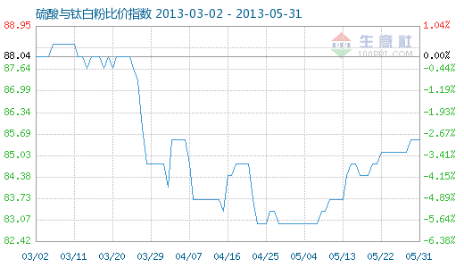 5月31日硫酸與鈦白粉商品比價指數(shù)為85.51,與昨日持平,較周期內(nèi)最高點111.23點(2012-05-31)下降了23.12%,較2013年05月07日最低點82.97點上漲了3.06%。(注:周期指2012-01-01至今)