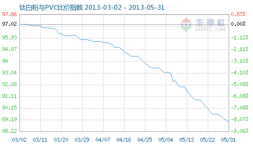 5月31日鈦白粉與PVC商品比價(jià)指數(shù)為89.03,較昨日下降了0.14點(diǎn),創(chuàng)下周期內(nèi)的歷史新低,較2012年03月14日最高點(diǎn)117.09點(diǎn)下降了23.96%。(注:周期指2012-01-01至今)