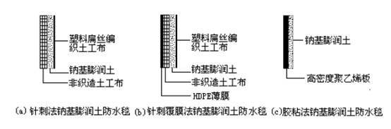 按制作方法分為針刺法鈉基膨潤(rùn)土防水毯(代號(hào)為GCL-NP)、針刺覆膜法鈉基膨潤(rùn)土防水毯(代號(hào)為GCL-OF)和膠粘法鈉基膨潤(rùn)土防水毯(代號(hào)為GCL-AH),分別如下圖(a)、(b)、(c)所示。