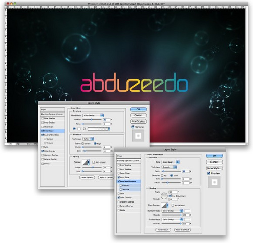 design frontier設(shè)計(jì)前沿當(dāng)前位置:首頁>主要服務(wù)>網(wǎng)站設(shè)計(jì)>設(shè)計(jì)前沿【教程】Photoshop打造水泡文字效果(2)步驟11 輸入標(biāo)志,去圖層>圖層樣式>混合選項(xiàng)。更改填充為0,然后選擇內(nèi)發(fā)光。使用顏色減淡,不透明度50%,改變大小為15像素。之后,選擇斜面和浮雕。使用內(nèi)斜面的風(fēng)格,90%的深度,方向?yàn)橄蛳?,大小?像素,軟化為5像素。對(duì)于陰影選項(xiàng)使用角度為70度,高度為16度。高光和陰影模式使用白色的顏色減淡,不透明100%。