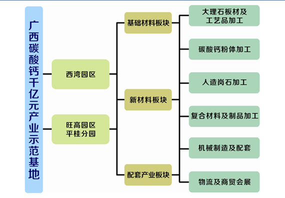 規(guī)劃建設(shè)廣西碳酸鈣千億元產(chǎn)業(yè)示范基地西灣園區(qū)、旺高園區(qū)平桂分園2個(gè)園區(qū),大力發(fā)展大理石板材及工藝品加工、碳酸鈣粉體加工、人造崗石、復(fù)合材料及制品生產(chǎn)、機(jī)械制造及配套和物流及商貿(mào)會(huì)展6大產(chǎn)業(yè),形成“大理石原料—大理石板材和工藝品—大理石邊角廢料回收—重質(zhì)碳酸鈣超細(xì)粉—合成人造大理石—新材料(涂料、塑料母粒、石頭紙等)”循環(huán)產(chǎn)業(yè)鏈,傾力打造廣西碳酸鈣千億元產(chǎn)業(yè)示范基地、全國(guó)最大的重質(zhì)碳酸鈣生產(chǎn)基地和最大的人造崗石生產(chǎn)基地,力爭(zhēng)2015年實(shí)現(xiàn)工業(yè)總產(chǎn)值100億元,2020年實(shí)現(xiàn)工業(yè)總產(chǎn)值600億元以上。