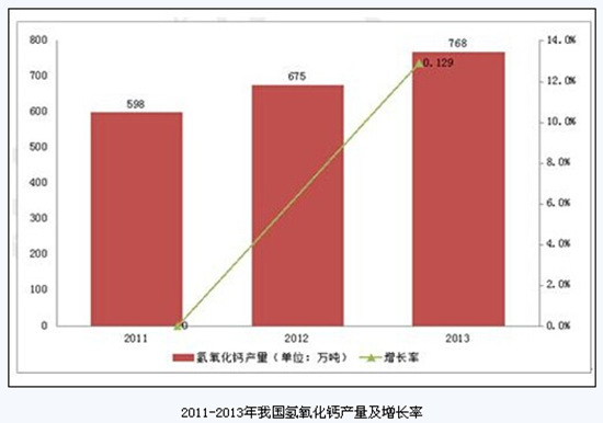 行業(yè)分析師指出:近年來(lái),我國(guó)氫氧化鈣行業(yè)一直以15%左右的增長(zhǎng)速度快速發(fā)展,2011年,我國(guó)氫氧化鈣的產(chǎn)量大約為598萬(wàn)噸,2012年,我國(guó)氫氧化鈣的產(chǎn)量大約為675萬(wàn)噸,同比增長(zhǎng)12.9%,2013年,我國(guó)氫氧化鈣的產(chǎn)量大約為768萬(wàn)噸,同比增長(zhǎng)13.8%。