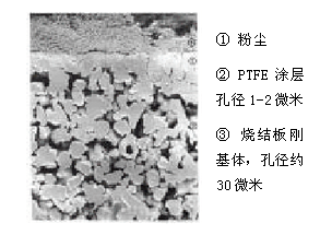 燒結(jié)板過濾元件是由多種高分子化合物粉體及特殊的結(jié)合劑嚴(yán)格組成后進(jìn)行鑄型、燒結(jié),形成一個(gè)波浪式多孔母體作為燒結(jié)板過濾元件的基板,基板厚約4mm,其內(nèi)部形成大約30微米的均勻孔隙,然后通過特殊的噴涂工藝在母體表面的空隙里填充PTFE涂層,形成1-2微米左右的孔隙。