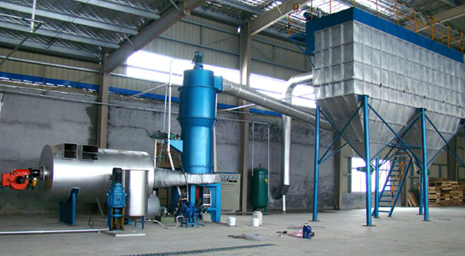 待干燥物料送入干燥段內(nèi)在粉碎裝置的作用下,與熱空氣充分接觸,干細(xì)粉通過(guò)分級(jí)機(jī)進(jìn)入收料系統(tǒng)被收集,未達(dá)到細(xì)度要求的物料在分級(jí)機(jī)的作用下,被下拋到干燥段內(nèi)繼續(xù)被粉碎和干燥。