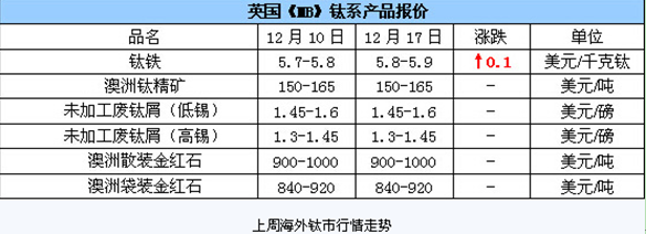 上周海外鈦市穩(wěn)中探漲。據(jù)英國金屬導(dǎo)報(bào)信息顯示,截至17日晚MB鈦鐵報(bào)價(jià)5.8-5.9美元/kg,再度上漲0.1美元;高錫級廢鈦屑報(bào)價(jià)1.3-1.45美元/磅,低錫級1.45-1.6美元/磅;澳洲鈦精礦150-165美元/噸;散裝金紅石900-1000美元/噸,袋裝金紅石840-920美元/噸,與上周持平。圣誕節(jié)即將到來,節(jié)前囤貨需求不斷增加,行情亦隨之攀升。預(yù)計(jì)下周海外鈦市或維持穩(wěn)勢。