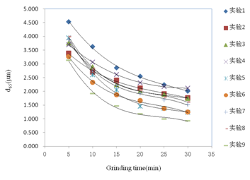 將表4中的粒度數(shù)據(jù)和研磨時間進(jìn)行擬合,如圖2所示。每組實(shí)驗(yàn)的多項(xiàng)式擬合度均大于0.99,擬合度較高。由擬合公式計(jì)算出d65為2μm時的研磨時間,再計(jì)算出每組實(shí)驗(yàn)的產(chǎn)量值,列入表6進(jìn)行直觀分析。