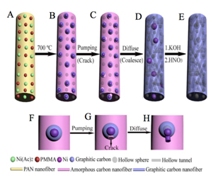 為了獲得同時具有高石墨化度和大比表面積的碳納米纖維,合作雙方經(jīng)過共同努力,利用納米鎳顆粒在無定形碳纖維基體中的催化石墨化原理,結(jié)合靜電紡絲和化學(xué)活化技術(shù),設(shè)計和制備了具有豐富石墨化隧道的“N-摻雜活化碳納米纖維”(ANHTGCNs)。該材料作為鋰離子電池負(fù)極材料時,具有高達(dá)1560 mAh/g的比容量,是目前商用石墨負(fù)極的4倍多,同時表現(xiàn)出優(yōu)異的循環(huán)與倍率性能。這種通過控制金屬顆粒的擴散路徑來調(diào)節(jié)無定形碳石墨化結(jié)構(gòu)的方法,為具有特殊石墨化結(jié)構(gòu)的一維碳納米材料制備提供了一條全新的思路。