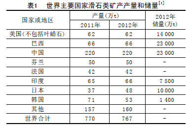 世界滑石儲(chǔ)量初步統(tǒng)計(jì)約為9億t,世界查明資源儲(chǔ)量約為29億t。據(jù)美國地質(zhì)調(diào)查局和中國國土資源部發(fā)布的資料,世界滑石類(包括葉蠟石)礦床分布在40多個(gè)國家和地區(qū),主要有美國、巴西、中國、法國、芬蘭和俄羅斯等,另外韓國和日本等國家和地區(qū)也有滑石礦床分布,但以葉蠟石為主。2012年美國地質(zhì)調(diào)查局報(bào)道了幾個(gè)國家的滑石類礦產(chǎn)的儲(chǔ)量和基礎(chǔ)儲(chǔ)量(見表1)。