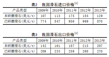 我國作為主要的滑石出口國,從2009年至今,我國滑石產(chǎn)品出口價(jià)格有了較大幅度的提高。根據(jù)我國海關(guān)統(tǒng)計(jì)數(shù)據(jù),2013年滑石塊出口平均價(jià)格207.37美元/t,滑石粉出口平均價(jià)格270.48美元/t。近年來,我國進(jìn)口滑石塊的價(jià)格呈上漲趨勢(shì),我國滑石粉產(chǎn)品進(jìn)口價(jià)格大幅度增長。