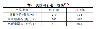 2011~2012年美國進(jìn)口滑石產(chǎn)品價(jià)格如表5所示。從表5可以看出,2012年進(jìn)口滑石價(jià)格與2011年相比有所增長。進(jìn)口未研磨滑石的平均單價(jià)與2011年相比有較大的增長。美國進(jìn)口已研磨滑石的單價(jià)呈上漲趨勢(shì),主要是由于從幾個(gè)貿(mào)易合作伙伴進(jìn)口的數(shù)量增加。