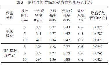 在閉孔膨脹珍珠巖和?;⒅閾搅肯嗤?0%)情況下(即配方不變),攪拌時間對不同保溫砂漿性能影響的比較見表3。
