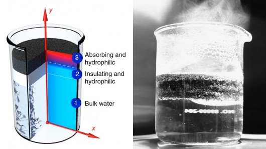 最底層是含有大量微小氣囊的碳泡沫結(jié)構(gòu),可以讓材料浮在水面上,同時(shí)這層材料也具有保溫隔熱功效,可以防止熱量從底部流失。不過(guò)這層材料的真正厲害之處,在于它可以將水轉(zhuǎn)化為水蒸汽,無(wú)數(shù)細(xì)小的孔洞在熱量的作用下通過(guò)毛細(xì)孔效應(yīng)將水吸上來(lái)。