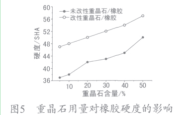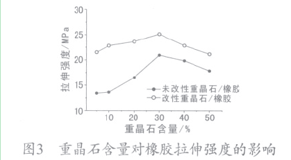 通過對重晶石純化和活化處理,采用硬脂酸活化后重晶石補強的橡膠,其正硫化條件150℃×4min。通過拉伸性能、硬度、耐磨性能的分析,活化后重晶石用量為30% 時,其拉伸強度為25MPa,斷裂伸長率達(dá)到900%,且橡膠復(fù)合材料的耐磨性能也有一定程度的提高。重晶石可以作為一種新型的橡膠補強材料,再加上偶聯(lián)劑的活化改性,因而具有優(yōu)異的補強效果及理想的加工特性。