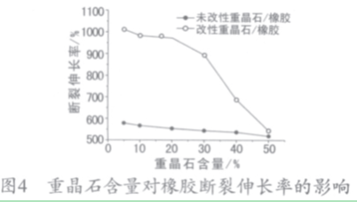 改性前后重晶石的用量對橡膠斷裂伸長率的影響,見圖4。從圖4 中可以看出,隨重晶石添加量的增加,重晶石/ 橡膠復(fù)合材料的斷裂伸長率呈逐漸降低的趨勢。未改性重晶石/ 橡膠材料的斷裂伸長率低,而改性重晶石/ 橡膠材料的斷裂伸長率明顯增加。