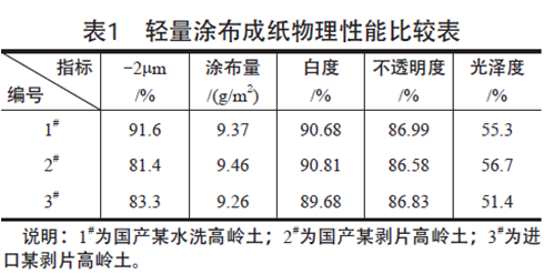 用相同或接近粒度組成的剝片高嶺土涂布的紙,比水洗高嶺土涂布的紙更白亮,顯示出極好的印刷性能,有顯著的高光澤度和表面強度。表1 所列為國內(nèi)某剝片土與水洗土、國外剝片土涂布成紙性能的比較結(jié)果。