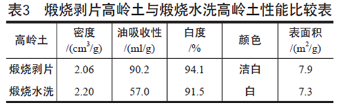 煅燒剝片土與水洗高嶺土在涂料上應(yīng)用,也有著較明顯的差別,物理性能比較的結(jié)果,見表3。