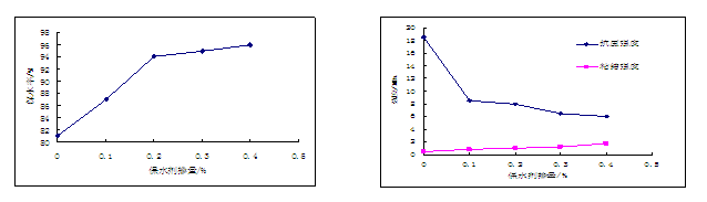 從左圖可以看出,隨著保水劑摻量的增加,粉刷石膏的保水率增大;從右圖可以看出,隨著保水劑摻量的增加,粘結(jié)強(qiáng)度增大,抗壓強(qiáng)度降低。當(dāng)保水劑摻量0.2%時(shí),保水率為94.4%,完全達(dá)到國(guó)標(biāo)粉刷石膏保水率大于90%的要求,同時(shí),剪切粘結(jié)強(qiáng)度達(dá)0.80MPa,抗壓強(qiáng)度達(dá)8.0MPa,均超過(guò)國(guó)標(biāo)要求。故保水劑摻量為0.2%最好。