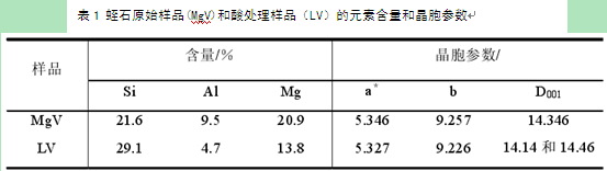 從表1可以看出:蛭石酸處理后,Si含量增加,Al、Mg含量明顯減小,原因是酸化可以洗出大部分層間Mg2+陽離子,被H3O+代替,少量八面體片陽離子被溶解;四面體片Al3+陽離子被部分溶出發(fā)生貧化,使得蛭石顯示出更強的表面活性;另外,酸可以在蛭石表面腐蝕出一些細(xì)微的凹坑,從而增大了蛭石的比表面積,使得其表面電性增強以及吸附面積的增大,促使吸附能力增強。再者,由于八面體片的尺寸比原來的尺寸要小,四面體片必須增大它們的旋轉(zhuǎn)角度以確保二者吻合,因此酸處理的蛭石的a和b要比未處理的蛭石小。