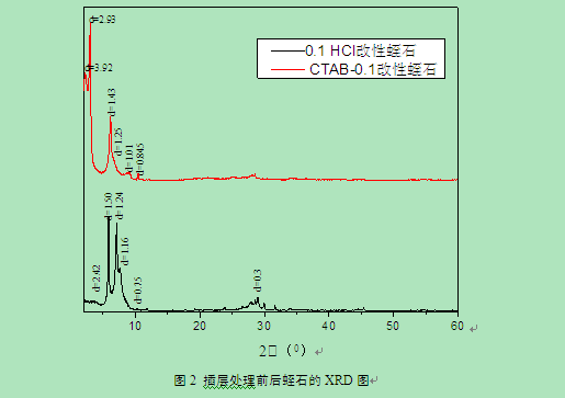 筆者對酸處理后的蛭石的CTAB改性進(jìn)行了實驗研究,樣品XRD圖見圖2。結(jié)果表明,經(jīng)過CTAB插層改性處理后,蛭石的層間距明顯增大,表明CTAB分子可以進(jìn)入蛭石層間,并將層間距擴大。