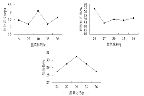 由圖 3可以看出,樣品的拉伸強(qiáng)度隨著氫氧化鈣用量的增加,呈先增加后減小的趨勢(shì),在氫氧化鈣用量為 30g 時(shí)達(dá)到最大值(8.1MPa),在氫氧化鈣用量為 24g、36g 時(shí),拉伸強(qiáng)度分別為 7.46、7.66,和最高點(diǎn) 8.1 相差不大;樣品的斷裂伸長率隨著氫氧化鈣用量的增加,呈先減小后不斷穩(wěn)定的趨勢(shì),在氫氧化鈣用量為 24g 時(shí)達(dá)到最大值(74.28%);氫氧化鈣用量的變化對(duì)樣品的氧指數(shù)影響不大,隨著氫氧化鈣用量的增加,氧指數(shù)先增大,在用量為 30g 時(shí)達(dá)到最高 30.5%,然后隨著用量的增加,氧指數(shù)減小。綜合考慮拉伸強(qiáng)度、斷裂伸長率、氧指數(shù)的大小,最終確定當(dāng)硫酸鎂用量為36g時(shí),氫氧化鈣最佳用量為24g。
