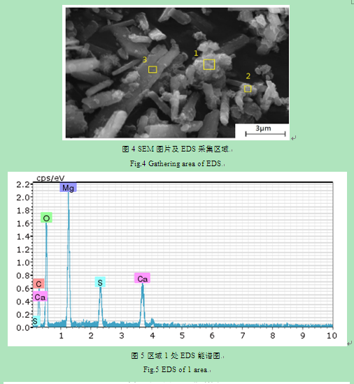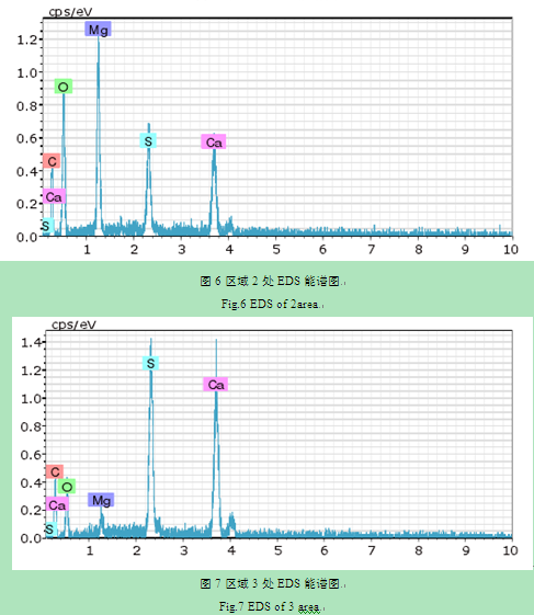 圖4中顆粒分布稀疏,團(tuán)塊狀物質(zhì)比較少,有一些條狀物、片狀物分布在基體表面上,推測(cè)片狀物為生成的氫氧化鎂,條狀物為碳酸鈣和新生成的硫酸鈣的混合物。
