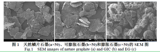 目前,國內(nèi)外制備膨脹石墨主要使用的方法包括:化學(xué)氧化法,超聲輻射法,電化學(xué)法,氣相擴散法及熔鹽法等。其中化學(xué)氧化法和電化學(xué)法是工藝上應(yīng)用比較廣泛的方法。圖1 為天然鱗片石墨、可膨脹石墨(GIC)和膨脹石墨(EG)的SEM 圖。