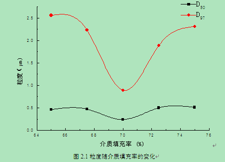 由圖2.1可知,介質(zhì)填充率在65%~70%的范圍內(nèi),產(chǎn)品粒度D50和D97出現(xiàn)了先緩慢上升后迅速下降的趨勢(shì);在70%~75%的范圍內(nèi),產(chǎn)品粒度隨磨機(jī)轉(zhuǎn)速的增大而明顯增加再小幅下降;當(dāng)?shù)V漿濃度為70%時(shí),產(chǎn)品粒度達(dá)到最細(xì),其D50和D97分別為0.24μm和0.89μm。故最佳的研磨介質(zhì)填充率為70%。