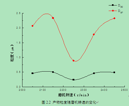 由圖2.2可知,磨機(jī)轉(zhuǎn)速在2050~2250r/min的范圍內(nèi),產(chǎn)品粒度D50和D97出現(xiàn)了先緩慢上升后迅速下降的趨勢(shì);在2250~2450r/min的范圍內(nèi),產(chǎn)品粒度隨磨機(jī)轉(zhuǎn)速的增大而明顯增加;當(dāng)磨機(jī)轉(zhuǎn)速為2250r/min時(shí),產(chǎn)品粒度達(dá)到最細(xì),其D50和D97分別為0.24μm和0.89μm。所以取2250r/min的轉(zhuǎn)速為最佳的磨機(jī)轉(zhuǎn)速。