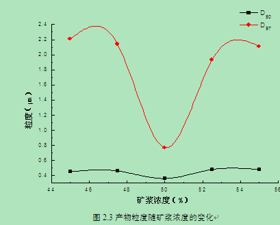 選取礦漿濃度45%、47.5%、50%、52.5%、55%,介質(zhì)填充率70%,助磨劑添加量0.4%,在2250r/min的磨機(jī)轉(zhuǎn)速下研磨25min,產(chǎn)品粒度如圖2.3所示。