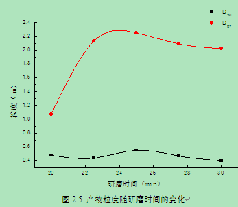 由圖2.5可知,D50在0.5μm左右浮動(dòng),且變化幅度很小。而D97在研磨時(shí)間為20~23.5min的范圍內(nèi)由0.48μm迅速增加到約2.3μm;在研磨時(shí)間為23.5~30min范圍內(nèi)則緩慢減小到2.02μm。由于D97是主要考察指標(biāo),而且也要考慮能耗,故確定最佳研磨時(shí)間為20min。