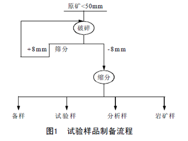 鄂式破碎機粗碎(2次)→對輥碎樣機中碎(1次)→縮分(一半留作副樣)→稱重對輥碎樣機中碎(3~6次)→篩分(過40目篩)→稱重(+40目和-40目分別稱重裝袋)。