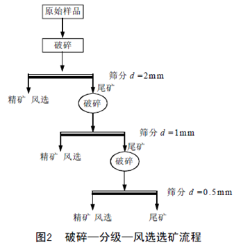 在篩分分析中發(fā)現(xiàn)云母較厚,直接風選困難較大,因此要采用鄂破至一定大小(<50mm)后再進行后道工序。