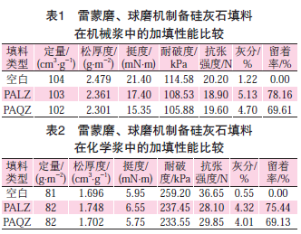 填料添加在機械漿、化學漿中進行抄片,研究其對紙頁各種性能的影響和在不同紙漿中的留著率方面的差異(如下表1、表2)。