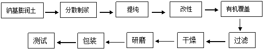 其中制漿、提純、改性和有機覆蓋是主要工序,制漿時將膨潤土與水充分混合,并除去其中的雜質(zhì)和砂礫,在混合過程中可邊加料邊攪拌,并加入分散劑。若是膨潤土純度不夠還需繼續(xù)提純。在改性的時為了增強膨潤土與有機覆蓋劑的作用,一般先用無機酸和氫離子交換樹脂對膨潤土進行活化預處理。在進行有機覆蓋時將礦漿加熱到38~80℃,并在不停攪拌的同時緩緩 加入有機覆蓋劑,然后連續(xù)攪拌30~6omin。充分反應(yīng)后停止加熱和攪拌,將懸浮液洗滌過濾、干燥然后打散解聚。即得到有機膨潤土產(chǎn)品。