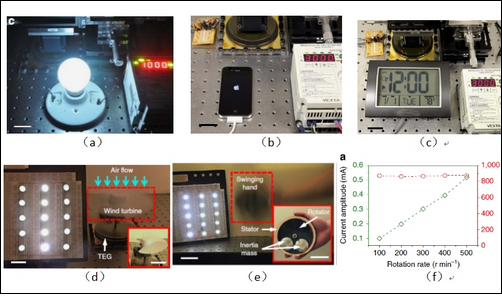 (a)點(diǎn)亮球形燈;(b)給手機(jī)充電;(c)給電子時(shí)鐘供電;(d)在風(fēng)力驅(qū)動(dòng)下實(shí)時(shí)點(diǎn)亮LED燈;(e)在手臂晃動(dòng)的驅(qū)動(dòng)下實(shí)時(shí)點(diǎn)亮LED燈;(f)轉(zhuǎn)速與開路電壓和短路電流的關(guān)系圖。