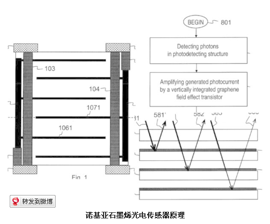 4、2012年8月,諾基亞的研發(fā)部門已經(jīng)在著手研究石墨烯光電傳感器,并且已經(jīng)在美國專利和商標(biāo)局注冊了一項專利。根據(jù)專利描述,石墨烯光電傳感器通過多層探測和放大層被互相疊放,以此來吸收和過濾相應(yīng)顏色的光。