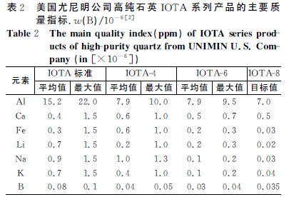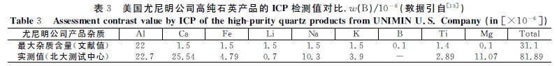 (5)開展高純石英產品質量檢測技術研究。由于高純石英純度高,需要測試的元素種類較多,常用的分析化學法和X射線熒光光譜法(XRF)均難以達到要求。目前普遍采用的測試方法是電感耦合等離子體發(fā)射光譜法(ICP-OES),該方法具有靈敏度高、精確度好、基體效應小、選擇性高、標準曲線線性范圍寬等優(yōu)點,對金屬元素具有良好的檢出限,可以在短時間內對數(shù)種元素同時進行測定。但是,如表3所示,目前用ICP檢測美國尤尼明公司產品的雜質含量(81.89×10 -6)比該公司在文獻上公布的最大雜質含量(31.1×10-6)數(shù)據(jù)普遍偏高,說明目前我國在低雜質檢測技術上尚存在一些問題。筆者的高純石英檢測實踐表明,在ICP檢測中,由于雜質含量很低,加之石英的難溶性,樣品重量、制樣方法、試劑純度和濃度以及測試條件等都可以成為影響檢測結果的重要因素。因此,開展高純石英產品質量檢測技術研究,建立相應的質量檢測標準, 是我國高純石英技術發(fā)展的基本保障之一。