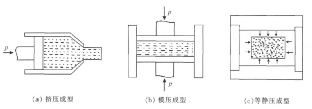 目前,炭素生產(chǎn)的成型方法有很多,其主要方法有擠壓成型(圖2a)、模壓成型(圖2b)、振動(dòng)成型、等靜壓成型(圖2c)等4 種。高純石墨的生產(chǎn)采用的是等靜壓成型,它有冷等靜壓成型和熱等靜壓成型兩種。等靜壓成型是將物料置于軟模具內(nèi),密實(shí)、密封后進(jìn)行抽真空,放入等靜壓機(jī)缸內(nèi),模具外的液體以相同的壓力從各個(gè)方向作用在模具上,壓制成圓柱形或長(zhǎng)方形的產(chǎn)品]。得到的產(chǎn)品在結(jié)構(gòu)和性能上具有各向同性,這是等靜壓制品最大的優(yōu)點(diǎn)。