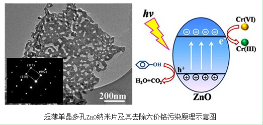 智能所科研人員在Cr(VI)的高效光催化材料方面進(jìn)行了系統(tǒng)的研究。他們制備出了一種厚度僅為12nm的超薄單晶多孔ZnO納米片。實驗表明,多孔結(jié)構(gòu)在納米片的表面造成了大量具有高催化活性的缺陷,這些缺陷作為空穴捕捉位點可以有效地提高材料對Cr(VI)光催化還原效率。同時,研究人員還發(fā)現(xiàn),當(dāng)體系里有有機(jī)物與Cr(VI)共存時,超薄單晶多孔ZnO納米片對Cr(VI)和有機(jī)物的催化還原和催化降解效率可以同時提高。該研究成果已發(fā)表于環(huán)境類期刊《危險材料雜志》,評審人認(rèn)為“這是一項有趣、新穎且有用的工作”。