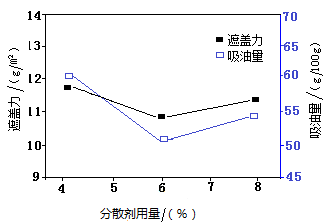 圖5 分散劑用量對復(fù)合產(chǎn)物吸油量與遮蓋力的影響