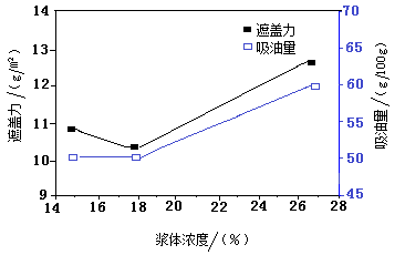 圖6 漿體濃度對復(fù)合產(chǎn)物吸油量與遮蓋力的影響