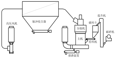 待粉磨的物料通過破碎機(jī)破碎成<50mm的顆粒。經(jīng)提升機(jī)送至儲(chǔ)料斗,可調(diào)速的皮帶給料機(jī)或震動(dòng)給料機(jī)從料斗經(jīng)罩筒進(jìn)料口定量輸送到主機(jī)腔內(nèi)。物料通過磨輥和磨環(huán)的相對(duì)運(yùn)動(dòng)而產(chǎn)生擠壓、碾壓成粉體。粉體通過磨內(nèi)選粉裝置,合格的粉體隨磨內(nèi)的氣流帶出,被旋風(fēng)收集器收集為成品,不合格的粗顆粒落回主機(jī)繼續(xù)被磨粉,同時(shí),為保持管路內(nèi)部氣流的平衡,多余的部分氣量經(jīng)風(fēng)機(jī)與主機(jī)之間的管道排到一套脈沖收塵器內(nèi),經(jīng)氣粉分離后從脈沖收塵器排到大氣。
