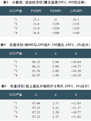 評(píng)價(jià):從以上兩個(gè)色差評(píng)價(jià)結(jié)果看出,GCC粒徑越細(xì)且分散越好的情況下,所得產(chǎn)品的外觀越好。